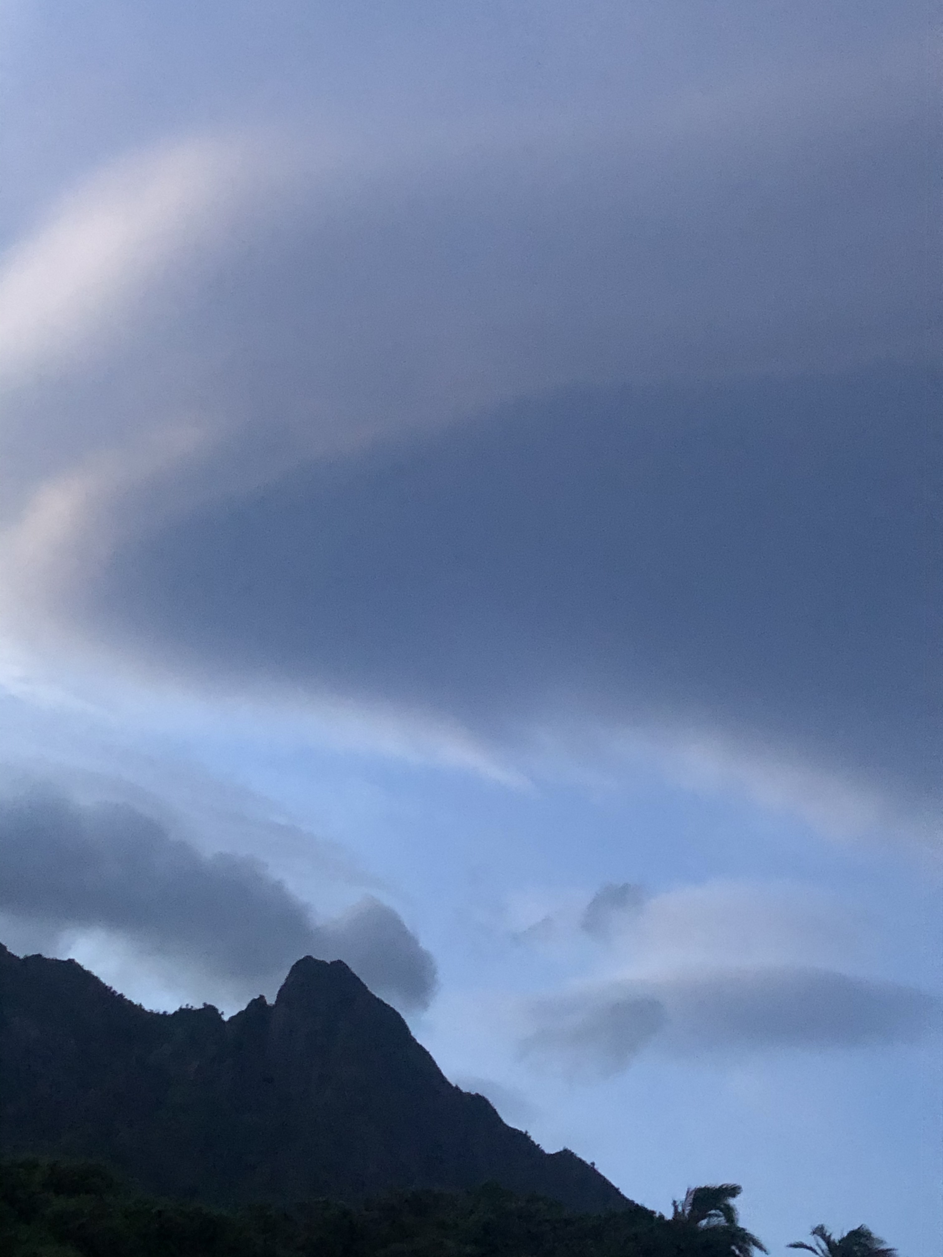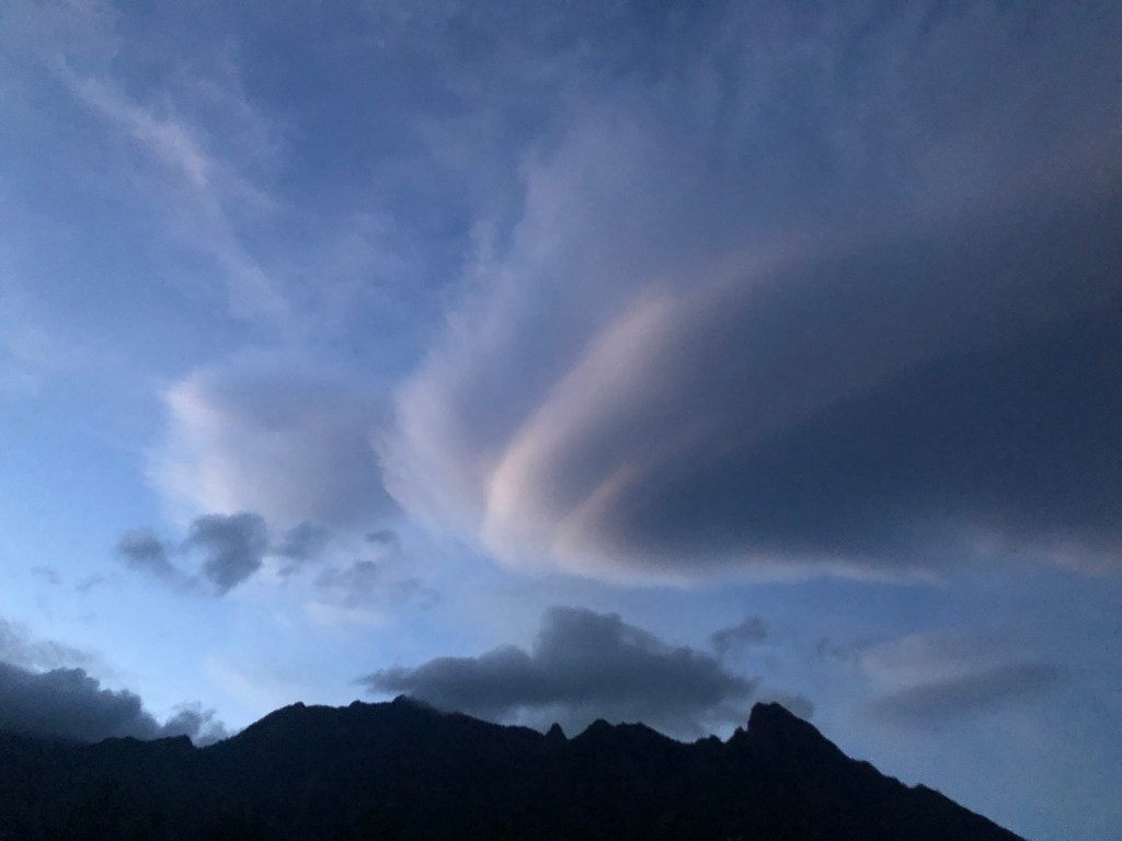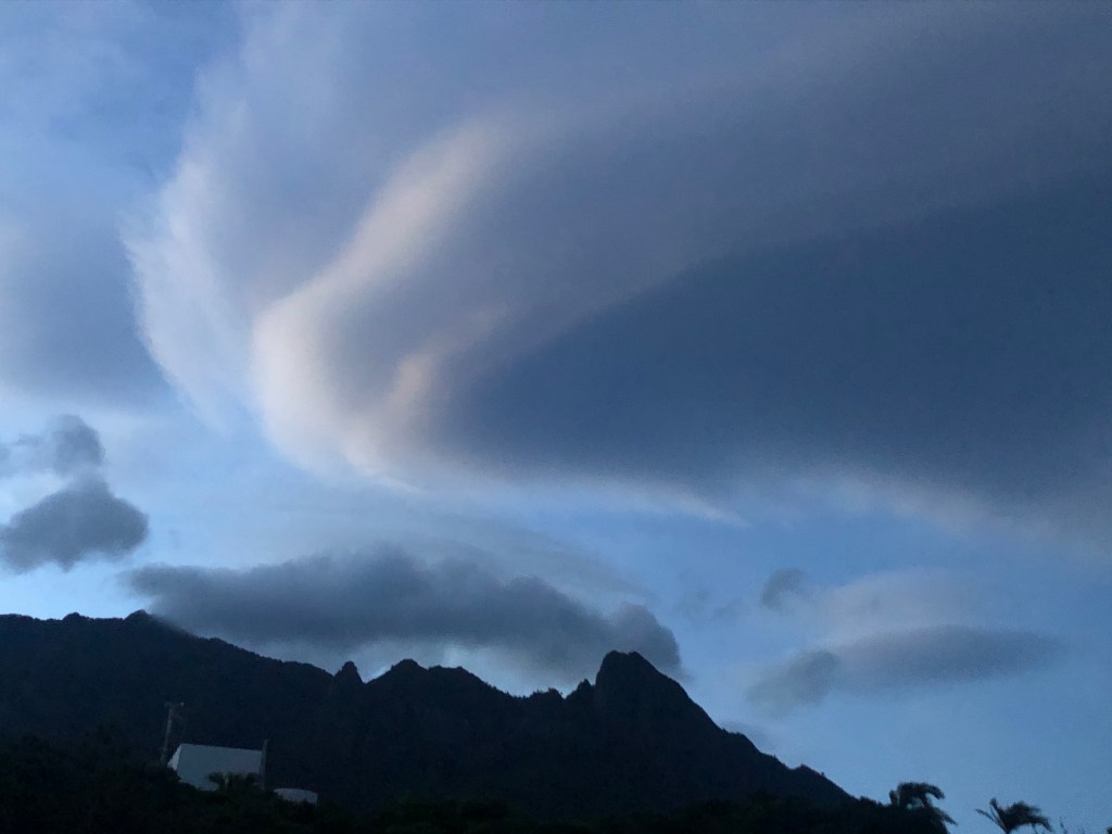 夏至の一週間前となったある日、気がつくと朝から氣になる雲がモッチョム岳上空に停滞していました。どこかで見たことあるような…そしてもうワクワクです!シャスタ山では何度も見たことがある、あのUFO雲を彷彿させます。前日は、まるで龍が頭の上で暴れ狂っているのかと思うほどの爆風に豪雨で自然界にすっかり翻弄させられたかと思いきや…本当に住んでみないと分からない屋久島の凄さというものをひしひし感じるのでありました。そして、これです!!