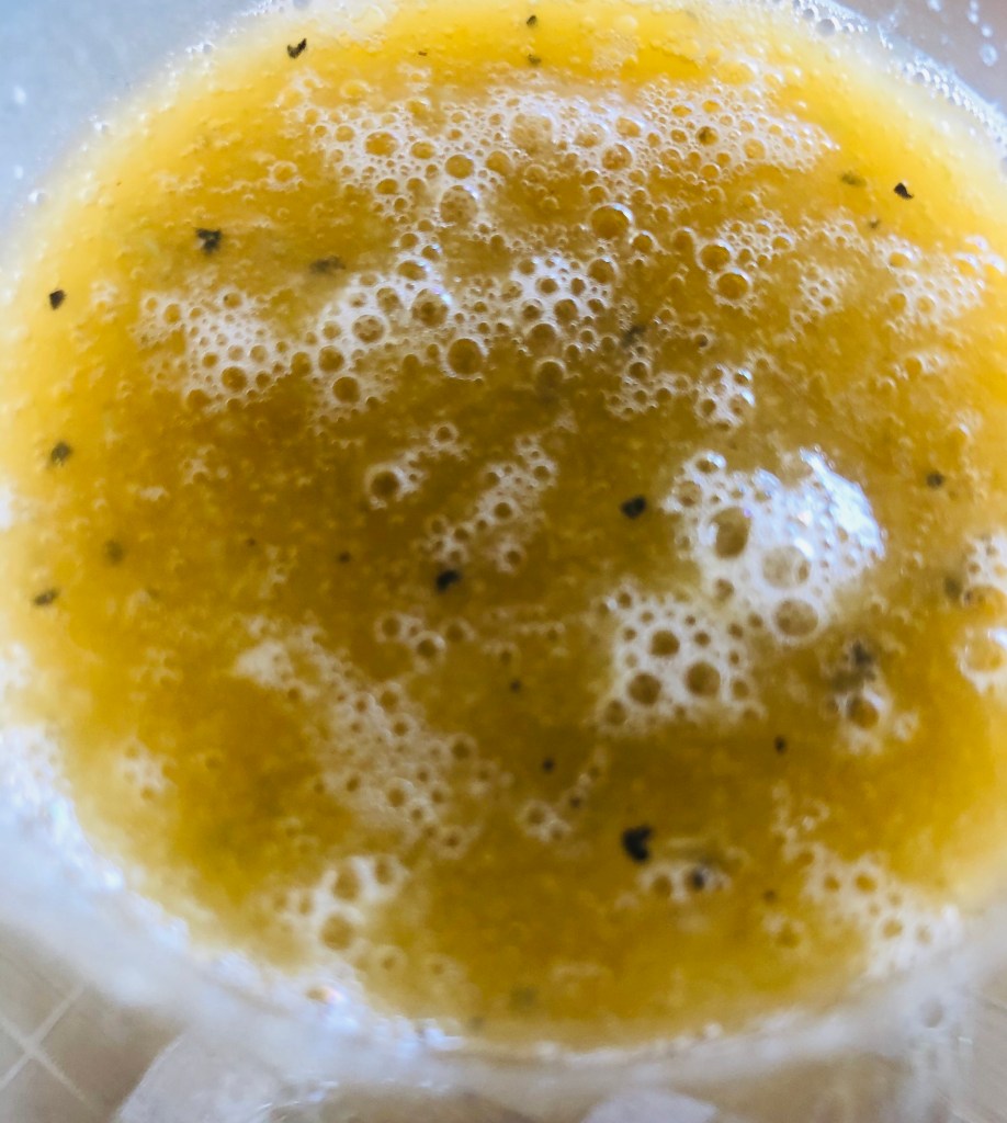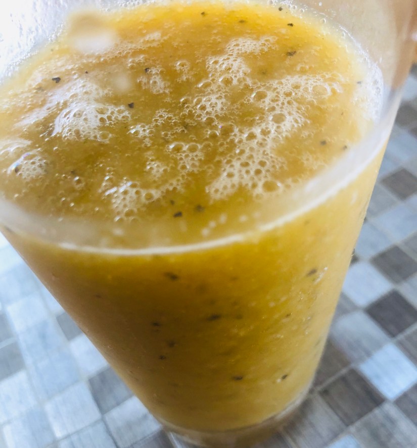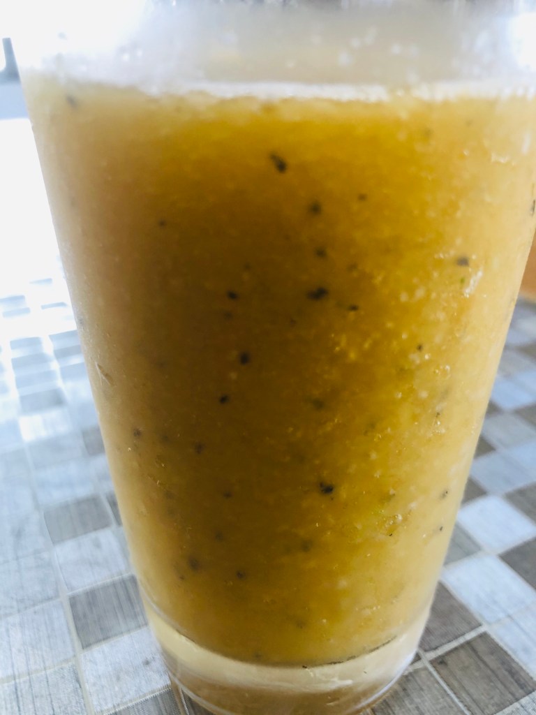 こちらは、今朝作ったスムージー!材料は、パパイヤ、ペピーノ、パッションフルーツ、モロヘイヤ(すべて屋久島産)、ジューシーオレンジ(熊本産)です。