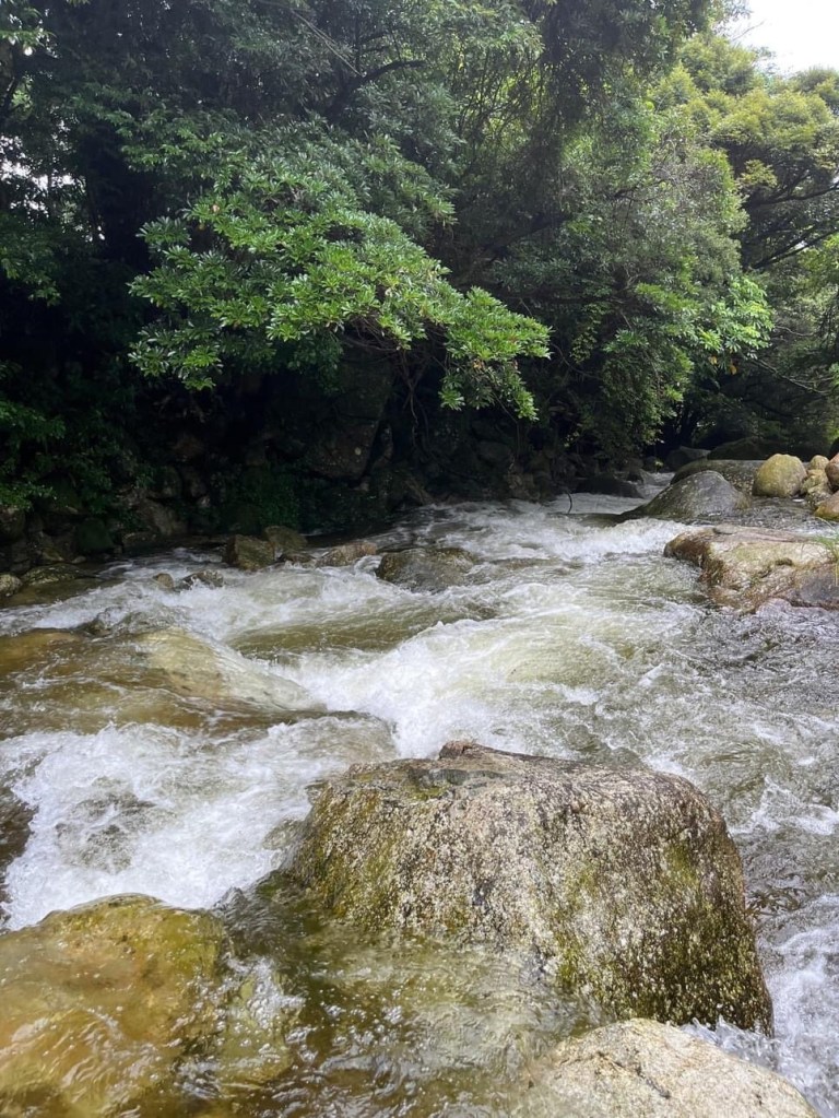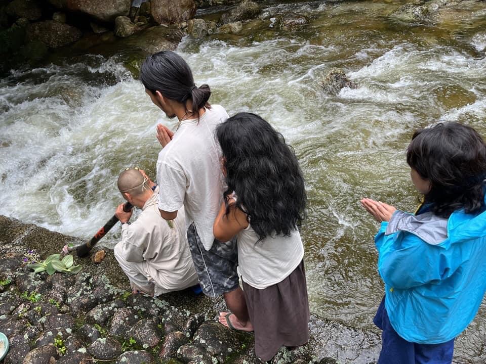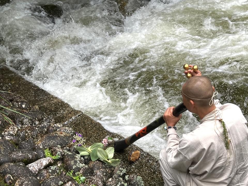そして、涙のお別れは翌朝です。朝から雷が鳴り響く中、私たちは、うなぎさんが天に宇宙に旅立つのを見送るため、うなぎさんが現れてくれたその場所に向かいました。そして、KNOBさんが石笛と五十鈴、ディジュリドゥの音を鳴らし祈りを捧げる中で、うなぎさんの頭と心臓を川にお返しして、弔いの儀式となりました。