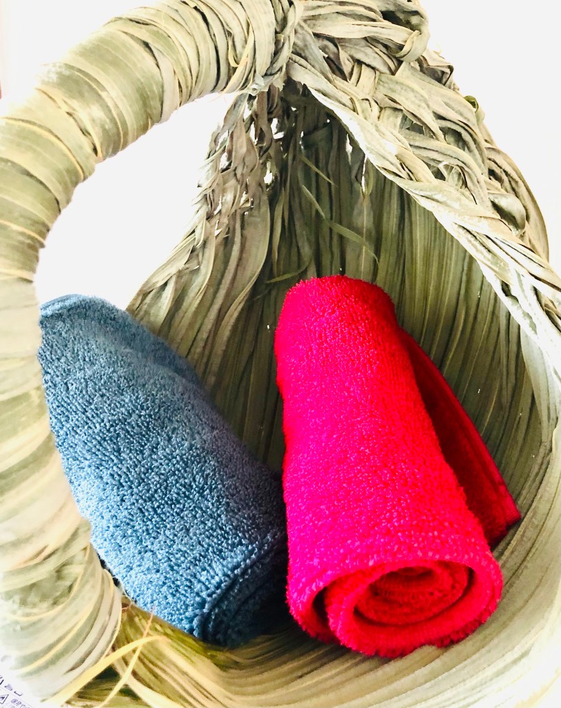 ちなみに、タオルを入れた籠は、ビロウの葉で編んだもの。屋久島在住の友人が主催するWSで作ったものです。このお話はまた後日に。